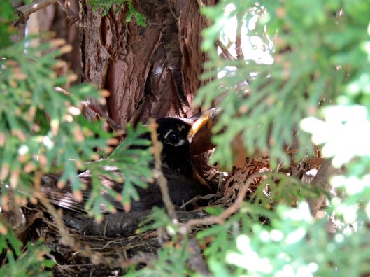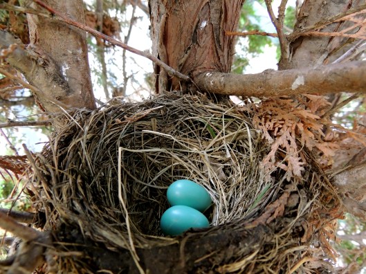 I posted a picture of two perfect robin’s eggs a few weeks ago taken in my parents’ backyard. They were so perfect that I may have accused my mom of planting two plastic eggs there as a bit of a joke. We went camping for a week and when we came back, there were three eggs! I planned to take a picture the next morning of the three eggs and when I checked there were four! It took me about twenty minutes to get a picture of the mother as I didn’t want to scare her off. Two of the eggs have now hatched, but I’m not there to try to get a picture and the ones my dad tried to take didn’t turn out. It really is a gorgeous colour.