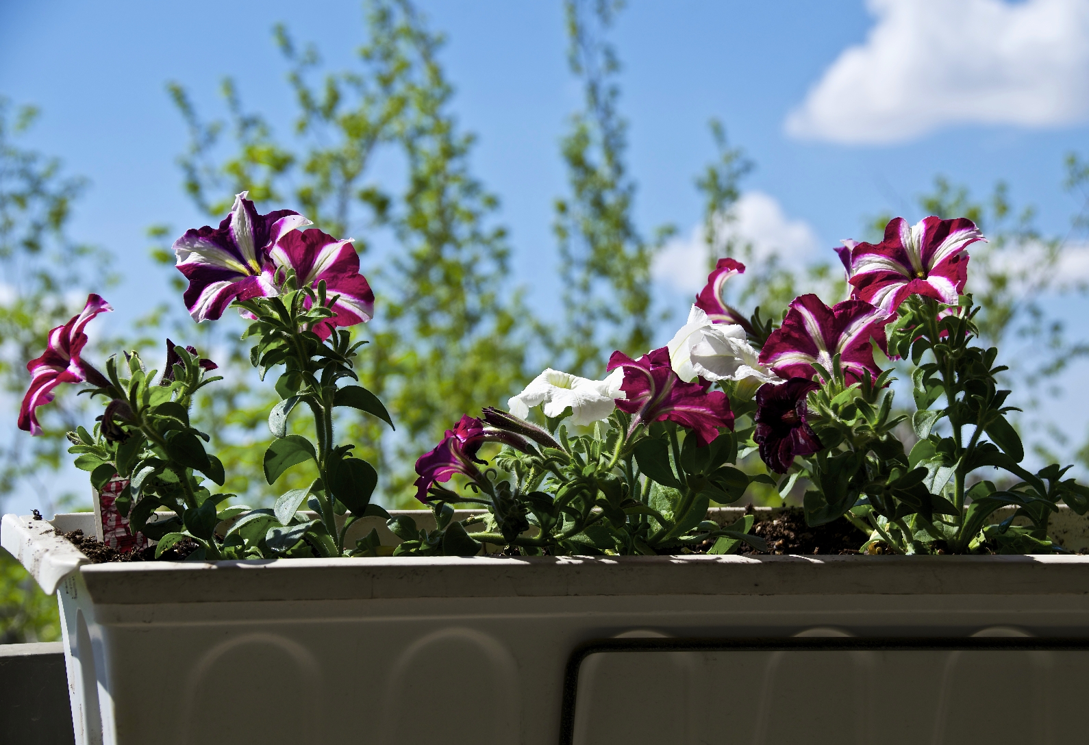 striped petunias and a blue sky