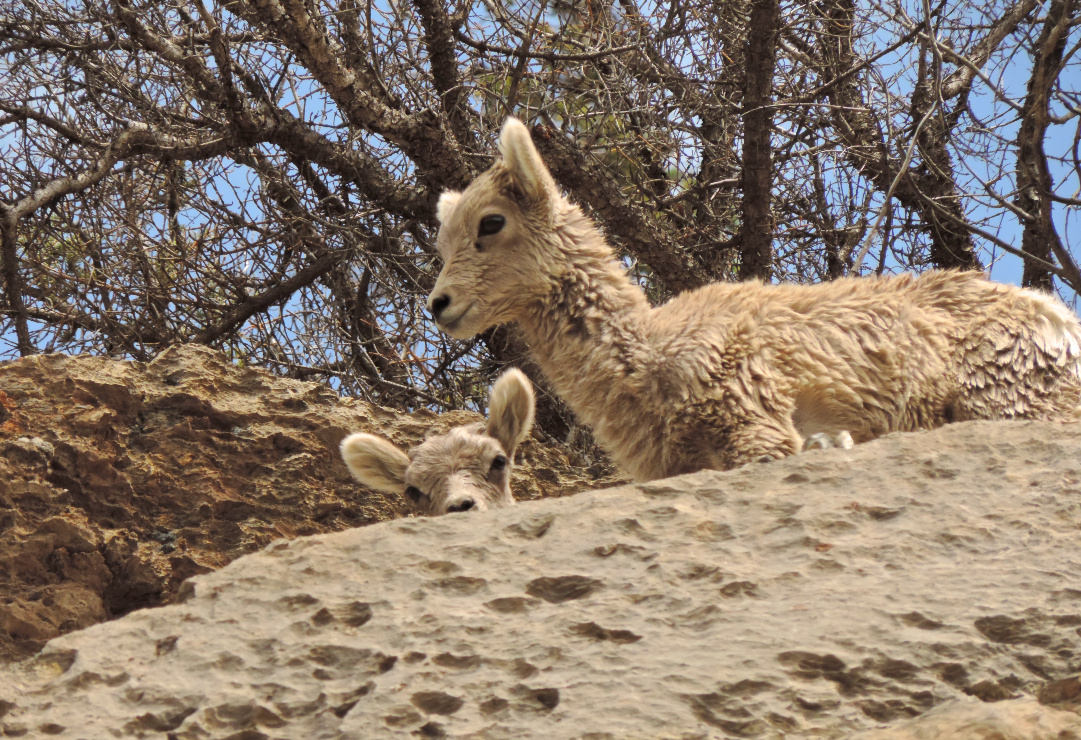 But, maybe this year! We were driving to Miette Hot Springs one afternoon and happened on some mountain goats grazing on the side of the road. Of course, we pulled over (because isn’t that what every tourist does when they see wild animals on the side of the road in a national park?!) The goats were across the road and my dad and I were standing beside a cliff taking pictures when I heard rocks falling. I looked up and saw these two little kids: